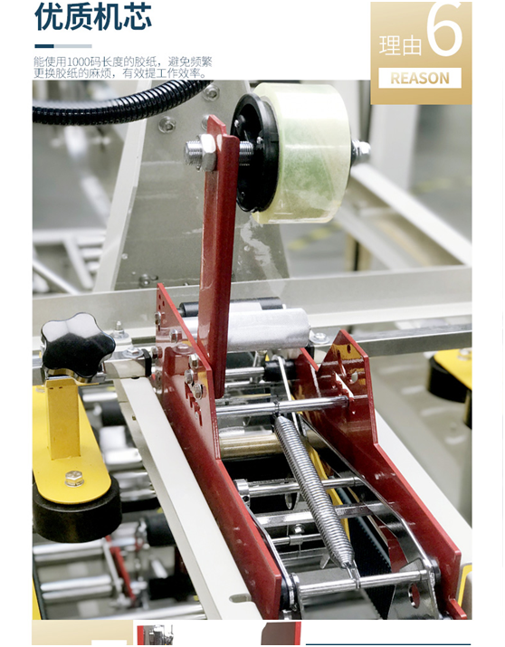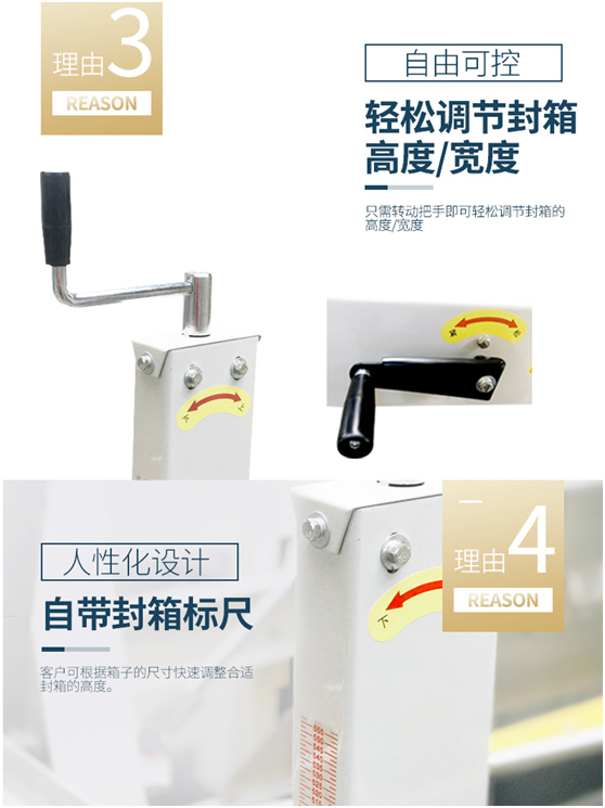 VFC-50折蓋封箱機(jī)能對(duì)紙箱的上蓋進(jìn)行自動(dòng)折合,但紙箱大小變化時(shí),需要人工調(diào)整梯形絲杠來調(diào)整封箱寬度和高度。紙箱上蓋自動(dòng)折入,平穩(wěn)順暢,封箱作業(yè)一氣呵成,美觀省力,可配合自動(dòng)化包裝系統(tǒng)使用。 折蓋封箱機(jī)新型貼帶器,不用鼓風(fēng)機(jī)吹挺膠帶,利用壓片裝置,使膠帶挺立不彎下而造成不能粘貼。上下升降使用進(jìn)口剎車缸,定位準(zhǔn)確。